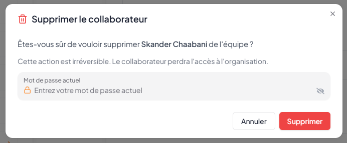 - Cliquez sur "Supprimer". Le membre perdra définitivement l'accès à votre organisation et son compte collaborateur sera supprimé.