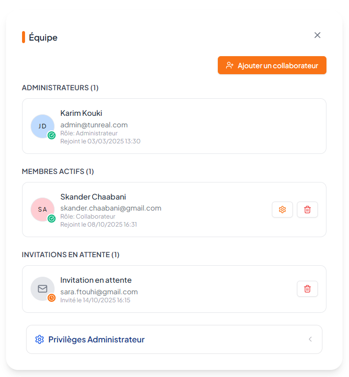 - Collaborateur : Le collaborateur a accès à toutes les fonctionnalités opérationnelles de TuniJobs (gestion des offres, CVthèque, candidatures...). Cependant, pour garantir la sécurité et la structure de l'équipe, il ne peut pas inviter, modifier ou supprimer des membres. Il peut uniquement consulter la liste des membres de l'équipe.