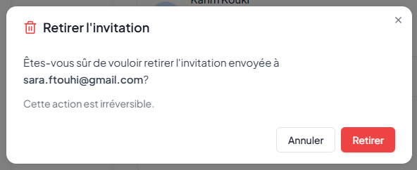 Si vous avez envoyé une invitation par erreur ou si la personne ne rejoindra finalement pas l'équipe, vous pouvez l'annuler. Sur la liste des "Invitations en attente", cliquez simplement sur l'icône "supprimer" (🗑️) à côté de l'invitation. Le lien envoyé par e-mail deviendra invalide.